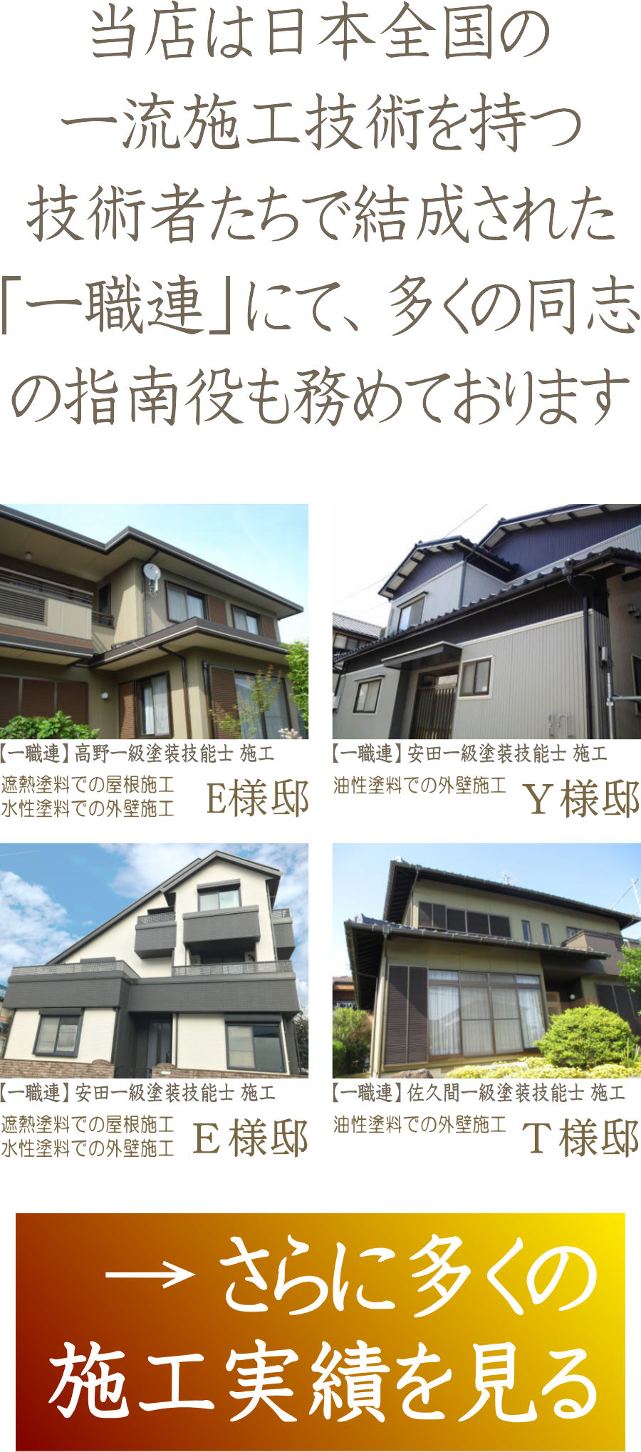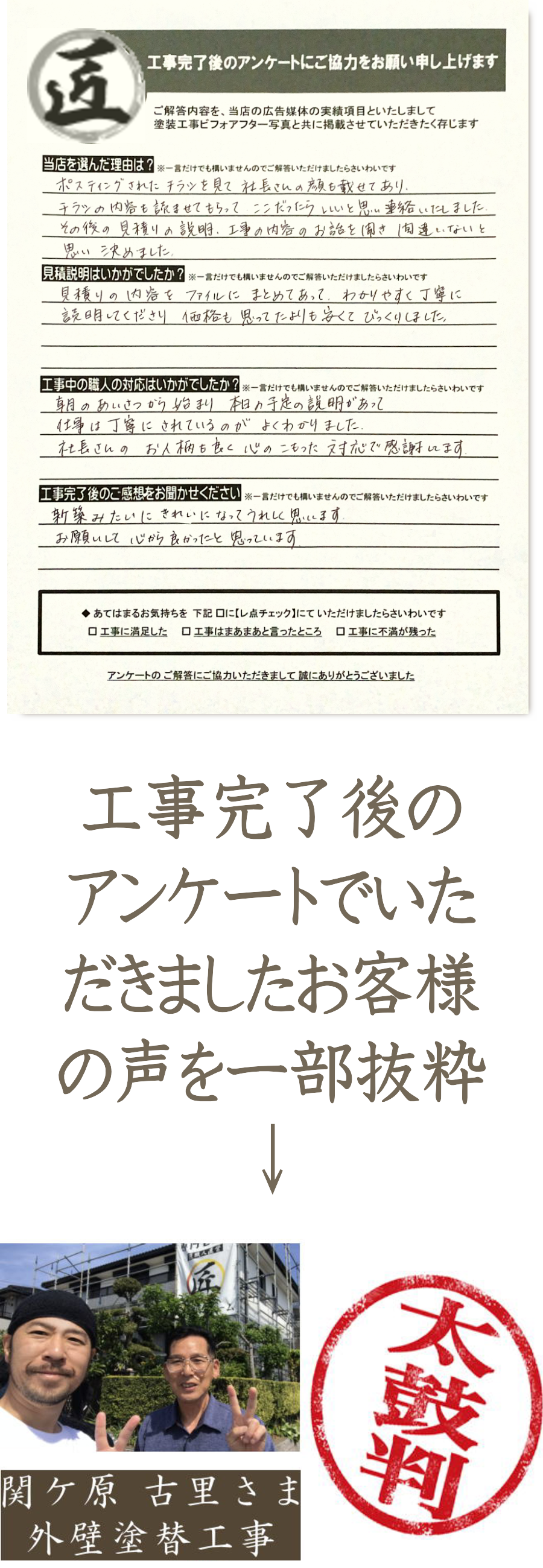 お向かいの吉原さんの お家の塗りかえ工事の時に、匠印の工事看板 を目にして、時間をかけて丁寧にきれいに工事してみえたので、吉原さんに紹介してもらい依頼をしました。工事を決めてから半年、順番を待ちましたが人気がある意味が理解できました。納得できるほどの丁寧できれいな完成。紹介してもらって本当